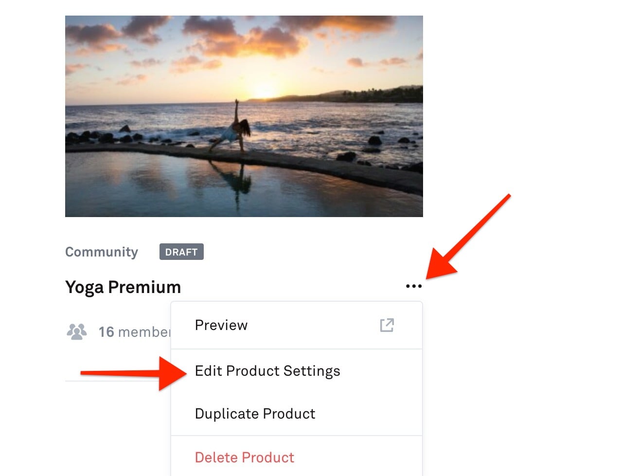 To add a product to a membership, ensure that it is first published by going to Products - and then clicking on the 3 dots to open the product settings: